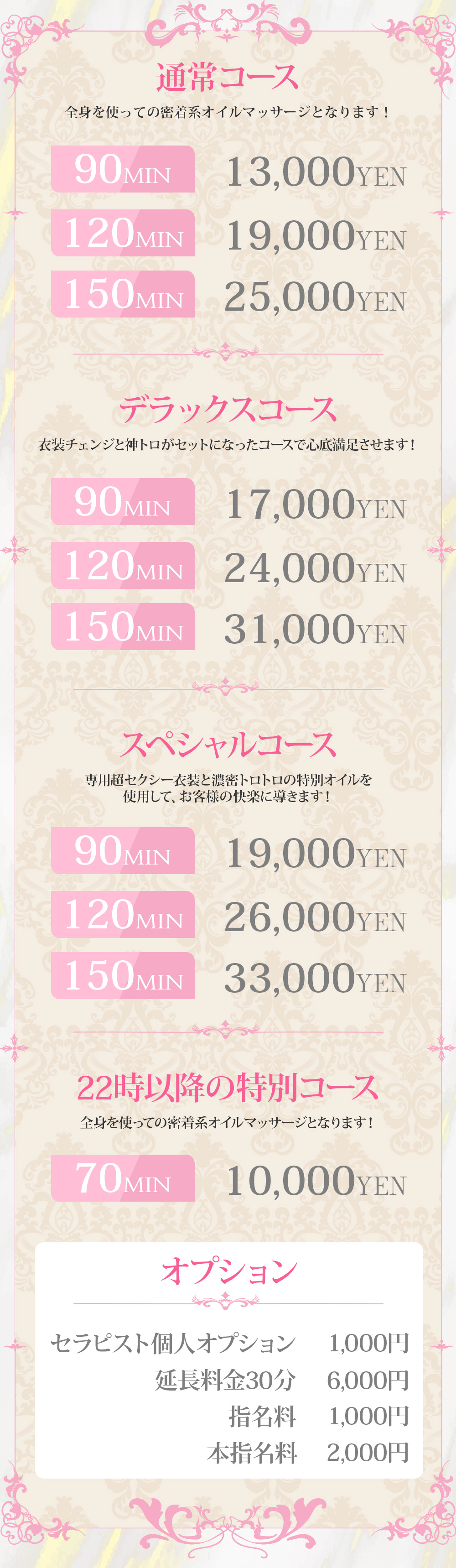 ・コースの変更はできかねます。当店のご利用規約に対いて違反行為があった場合には施術中であっても退店して頂き、次回からのご予約をお断りさせて頂きますのでご理解頂きますようお願いいたします。